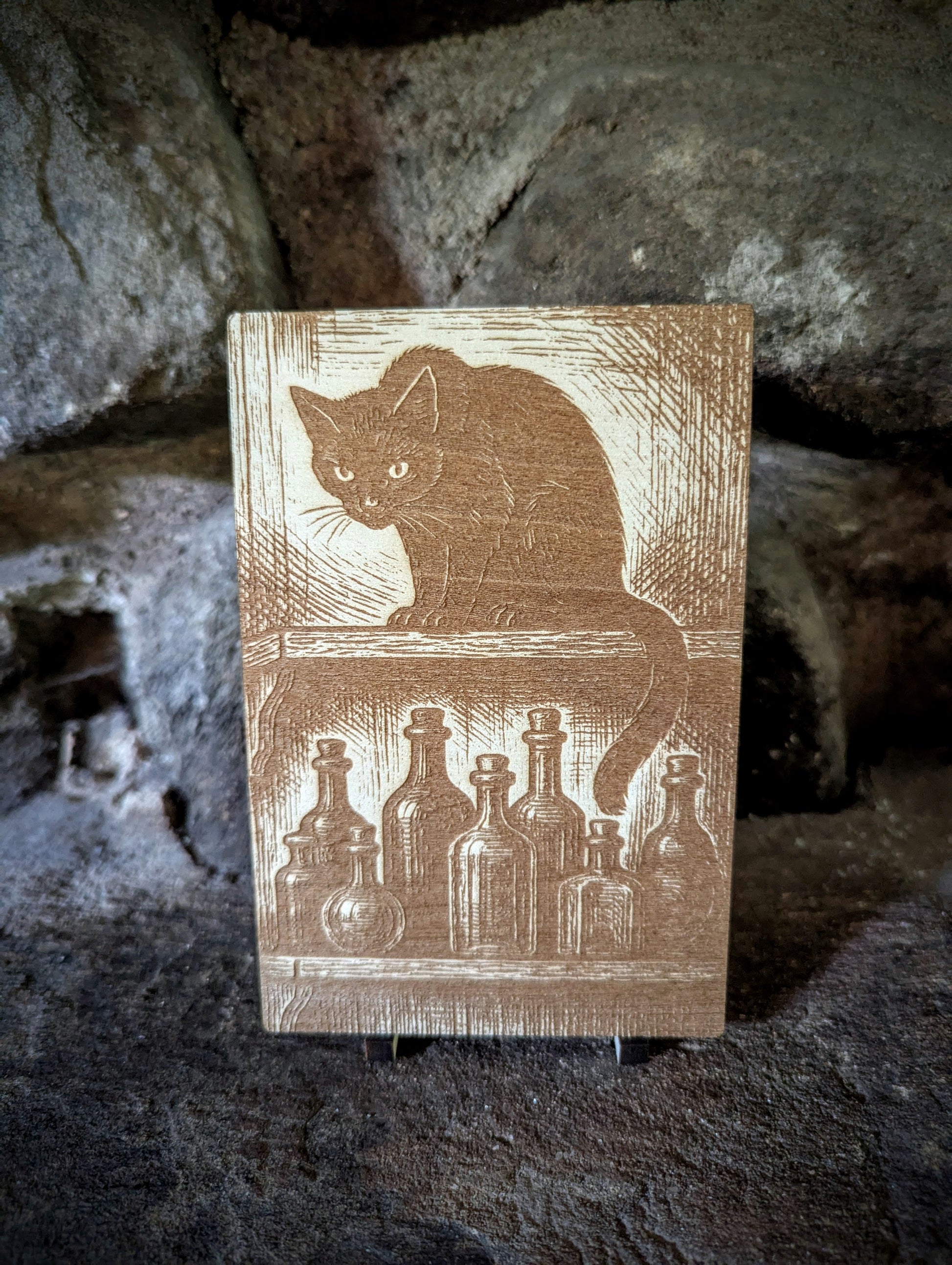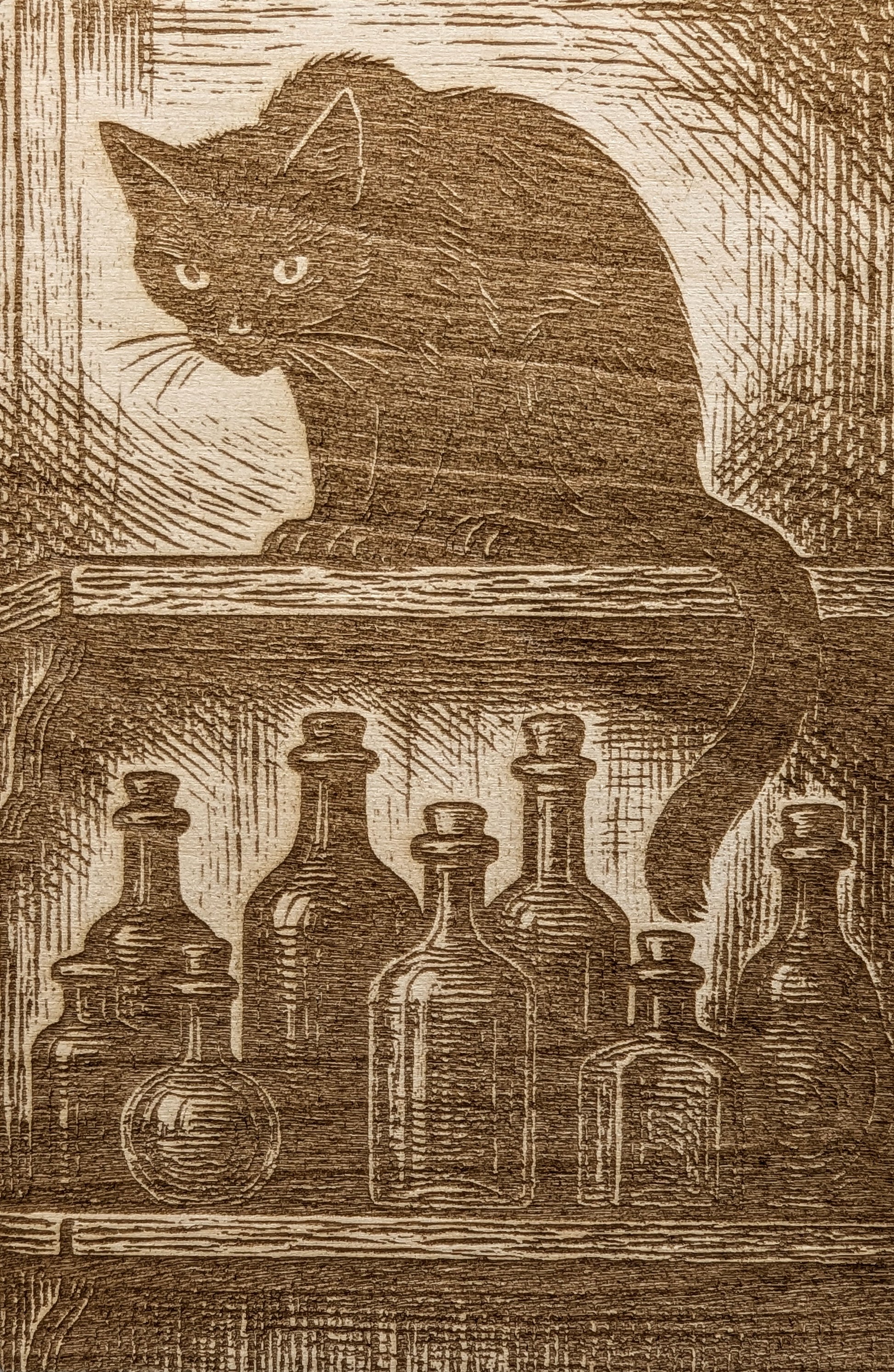 Black Cat on Shelf with Bottles, Woodcut Engraving
