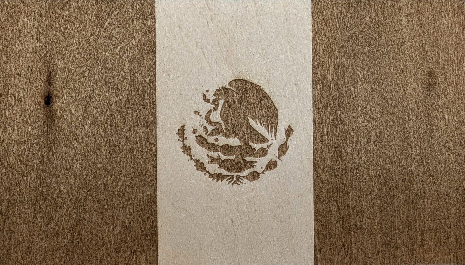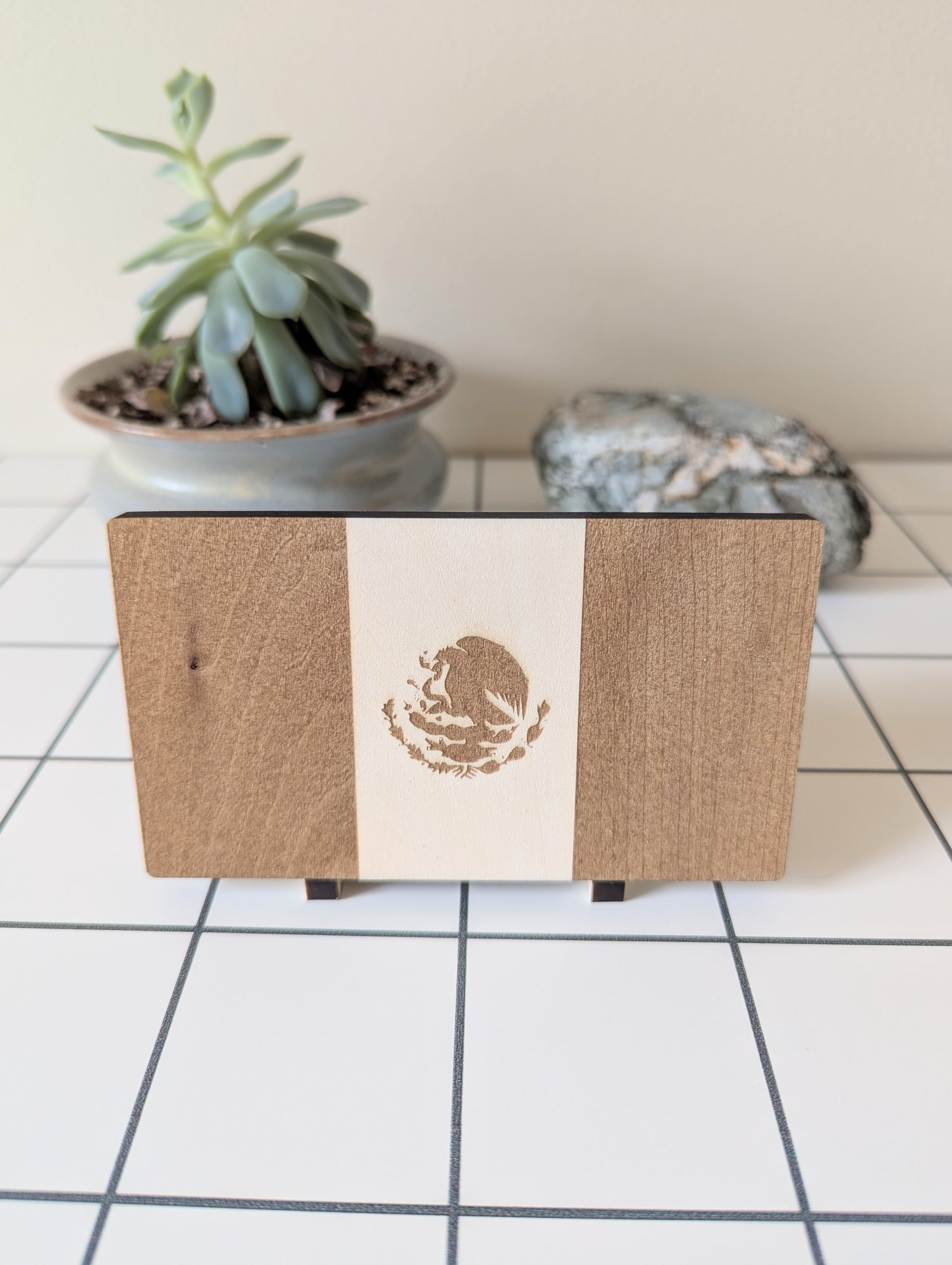 3.5 x 6 inches, 1/4 inch thick basswood. Includes a stand for upright display.